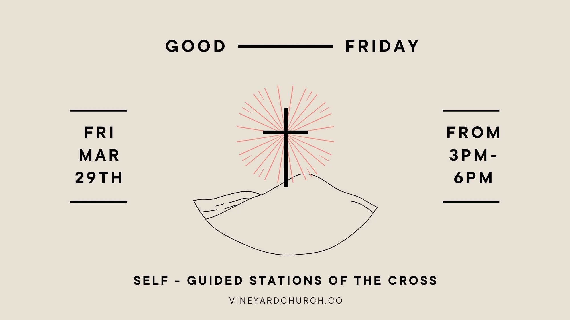 Good Friday - Stations of the Cross Friday, March 29th | 3PM-6PM — Join us on Good Friday for a self-guided journey through the stations of the cross. As we immerse ourselves in the story of Jesus' suffering and death, we open ourselves to experience his love and mercy in a powerful way. You can begin your journey anytime between 3 and 6pm, plan on 30 to 45 minutes to complete it. This is a silent activity and there will be activities in VKids for children.