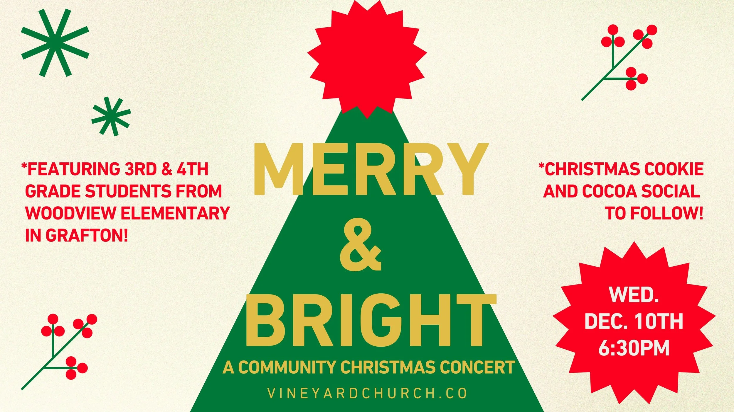 Let’s kick off the holidays together! The 3rd & 4th grade choir from Woodview Elementary will fill Vineyard Church with Christmas cheer during their annual concert! Additionally, Woodview’s very own (and our own) Mr. Joe Bertsch will be playing some songs we can sing along to. After the performance, stay for cookies and cocoa and a chance to connect with friends and family.
