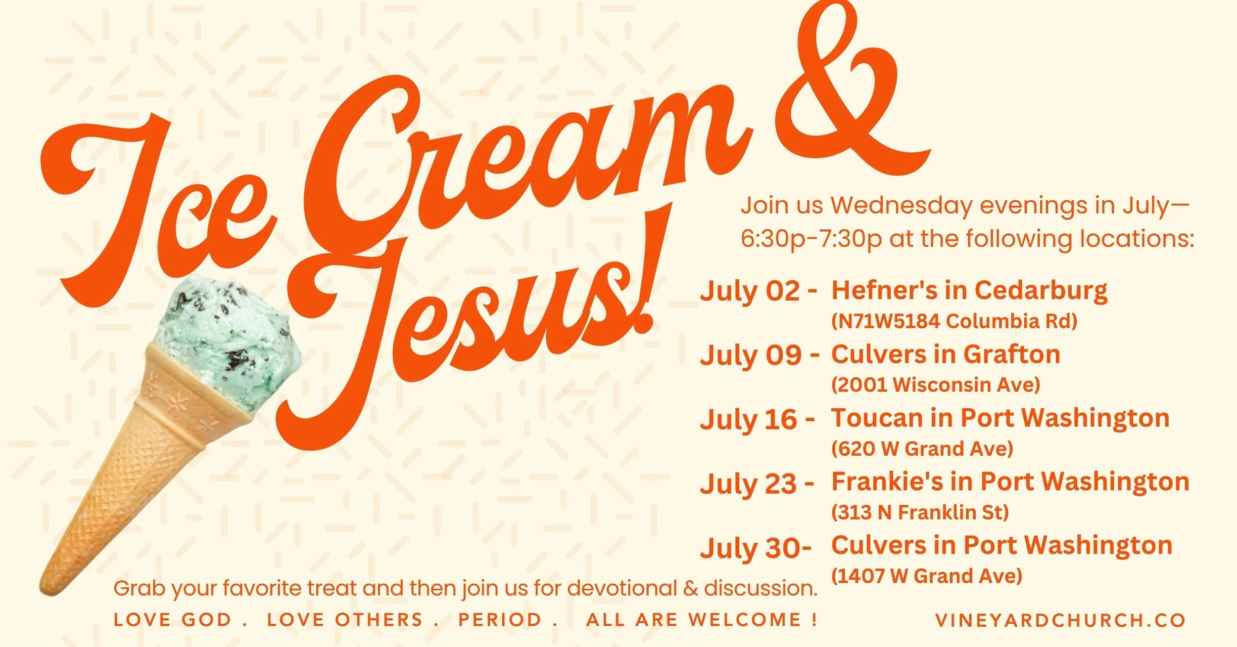 Grab your friends and family for an hour of delicious treats, meaningful devotions, and great conversation! Each week we’ll gather at a different local spot to enjoy some food and fellowship together.